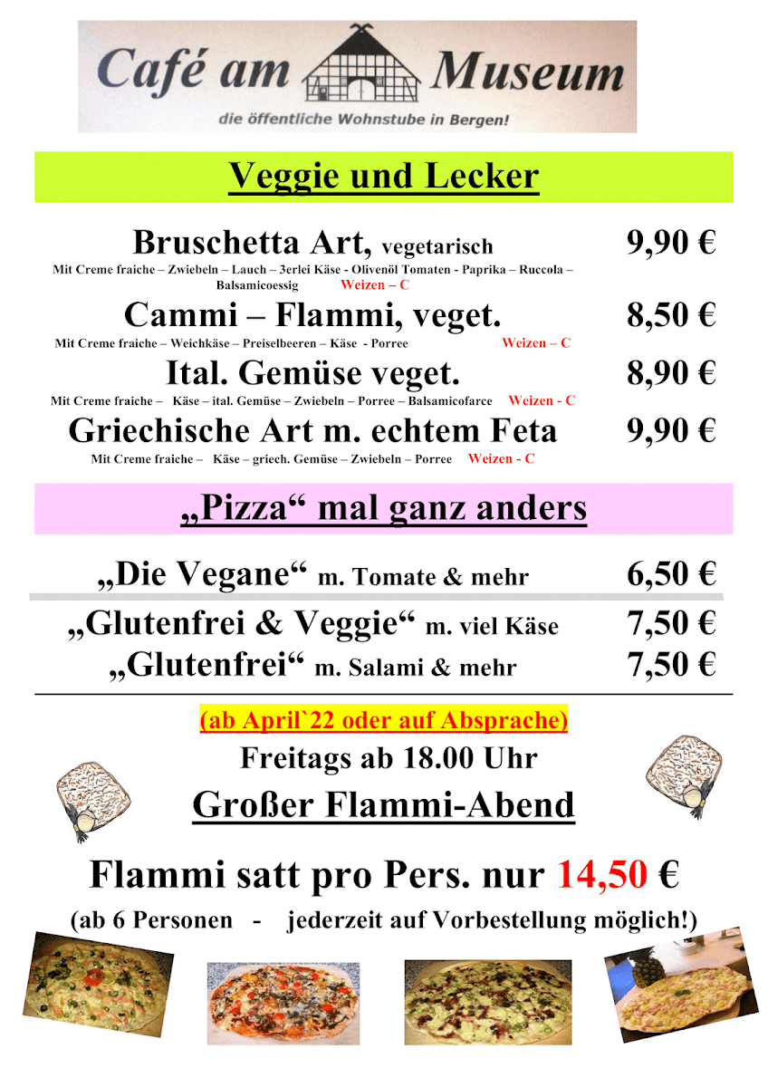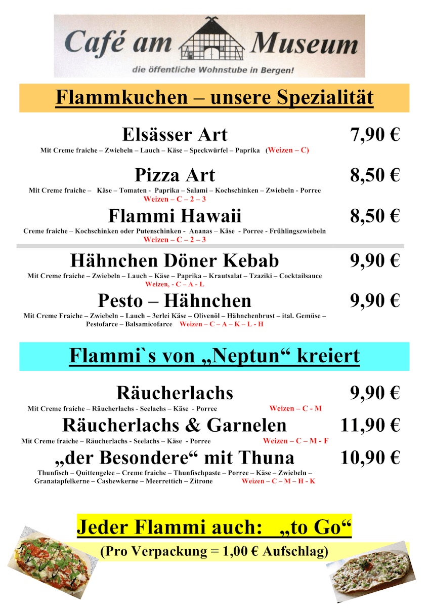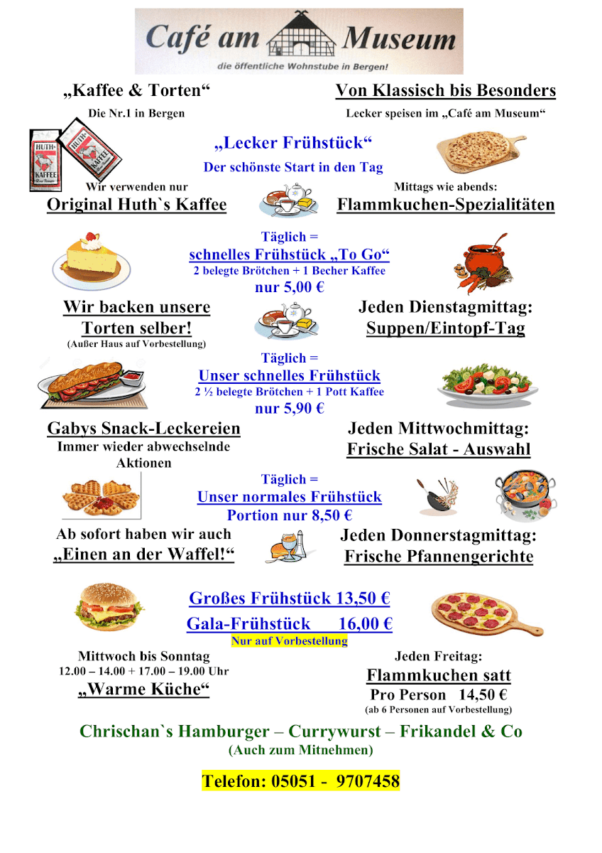 Overall, the menu at Café “am Museum” presents a concise yet appealing selection that balances variety with simplicity. The breakfast offerings (“Unsere Frühstücksangebote”) stand out as a strong starting point, suggesting a range of morning options likely suited for both light and hearty appetites, though specific pricing details are not provided. Equally noteworthy are the homemade tarte flambée selections (“Unsere selbstgemachten Flammkuchen”), which imply fresh preparation and a traditional touch, adding character to the menu. For those seeking something quick, the snack section (“Imbiss”) appears to complement the main items, while the drinks menu (“Getränke”) rounds out the experience with a presumably broad selection. Although the absence of clearly listed individual dishes and prices limits transparency, the structured layout and focus on house-made specialties leave a positive impression, suggesting a menu that prioritizes quality and a relaxed café-style dining experience.