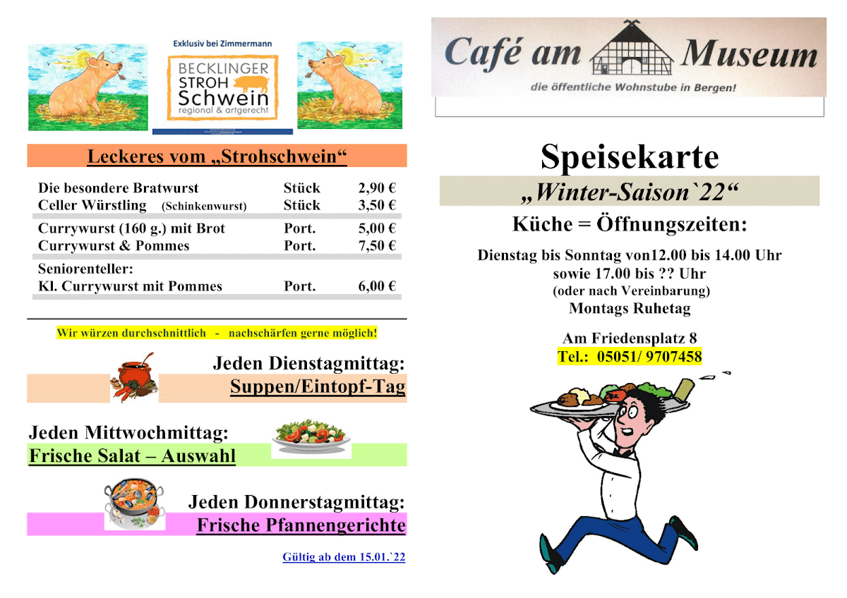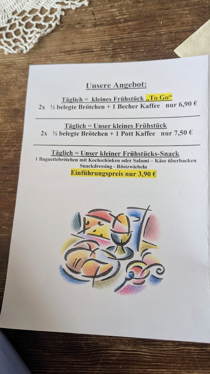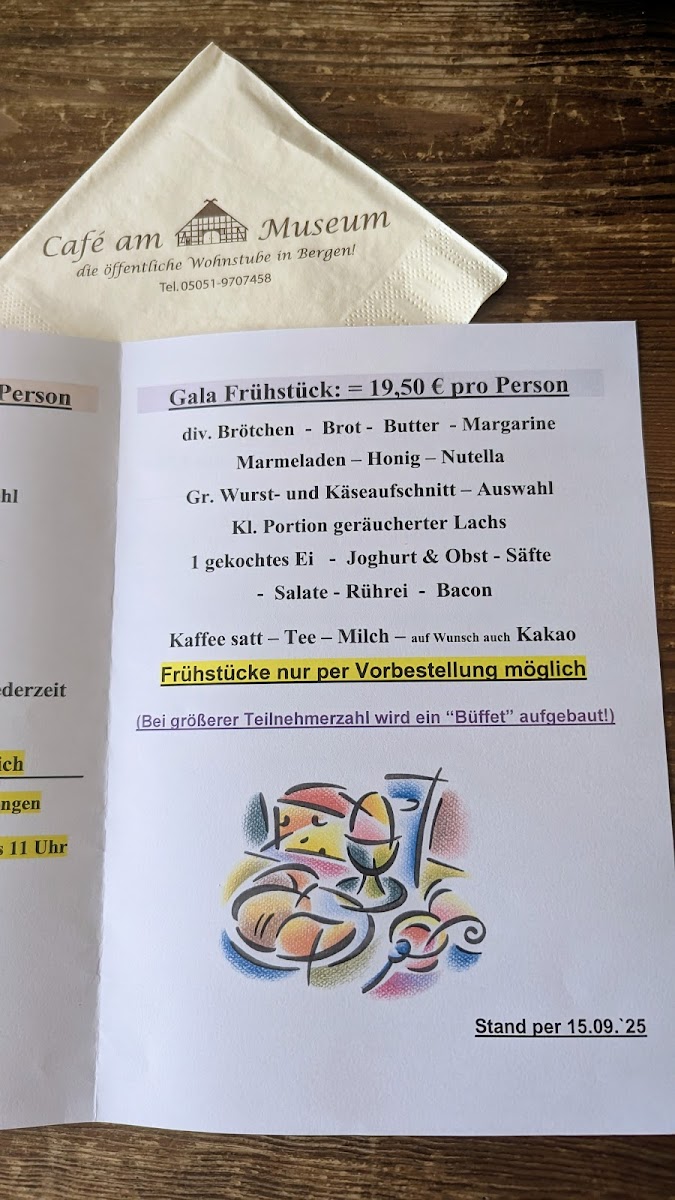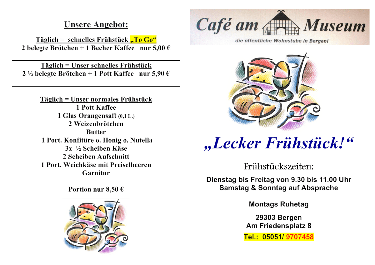 Overall, the menu at Café “am Museum” presents a concise yet appealing selection that balances variety with simplicity. The breakfast offerings (“Unsere Frühstücksangebote”) stand out as a strong starting point, suggesting a range of morning options likely suited for both light and hearty appetites, though specific pricing details are not provided. Equally noteworthy are the homemade tarte flambée selections (“Unsere selbstgemachten Flammkuchen”), which imply fresh preparation and a traditional touch, adding character to the menu. For those seeking something quick, the snack section (“Imbiss”) appears to complement the main items, while the drinks menu (“Getränke”) rounds out the experience with a presumably broad selection. Although the absence of clearly listed individual dishes and prices limits transparency, the structured layout and focus on house-made specialties leave a positive impression, suggesting a menu that prioritizes quality and a relaxed café-style dining experience.
